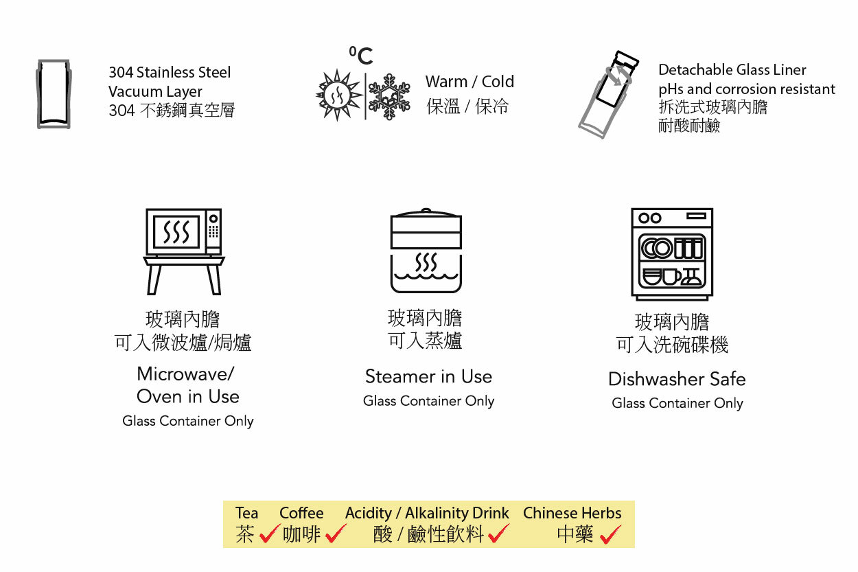 304 Stainless Steel Vacuum Flask x 1, Glass Inner x 1, Plastic Lid Set x 1