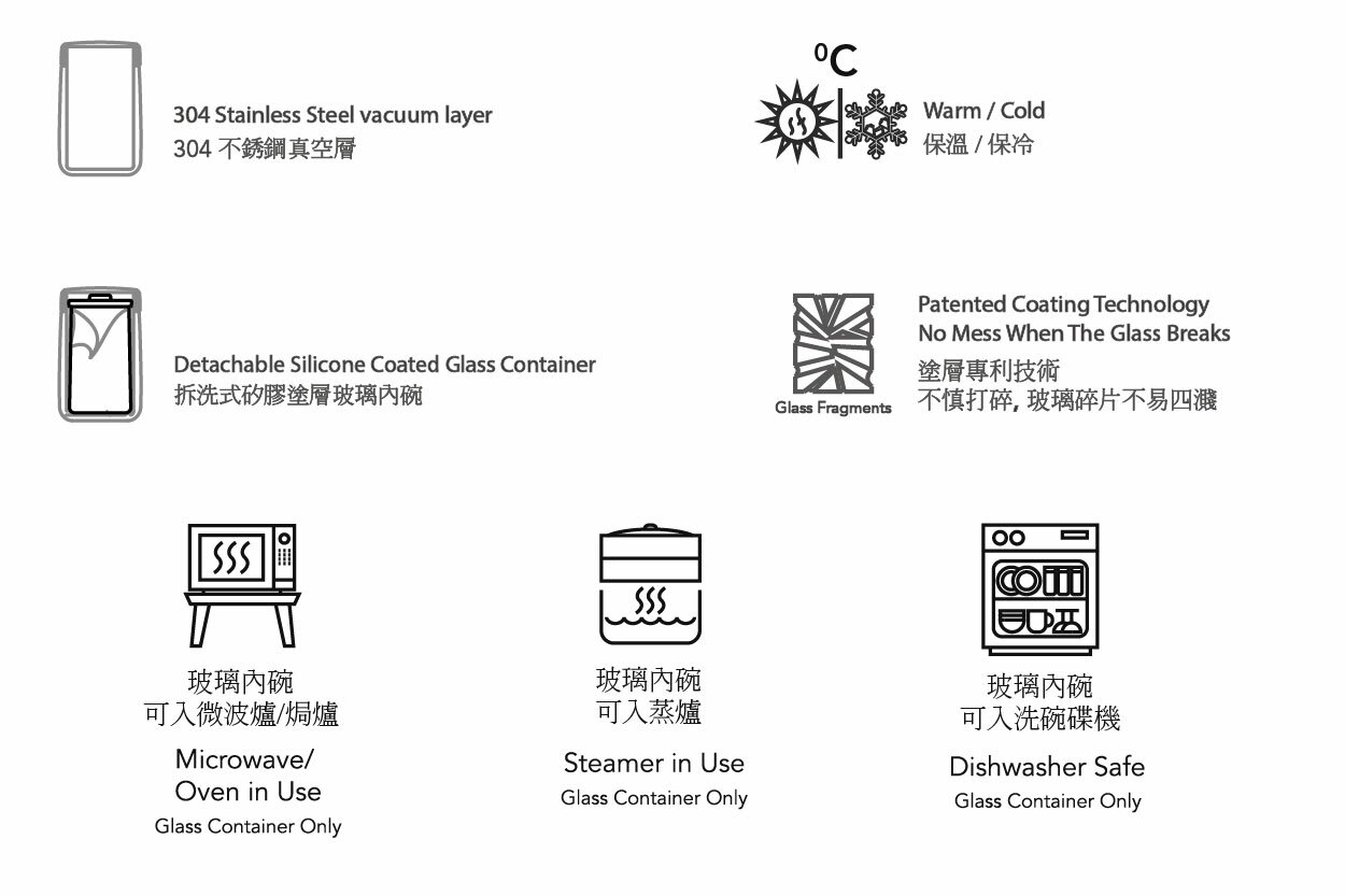 304 Stainless Steel Vacuum Flask x 1, Silicone Coated Glass Bowl with Silicone Lid x 1, Flask Lid x 1