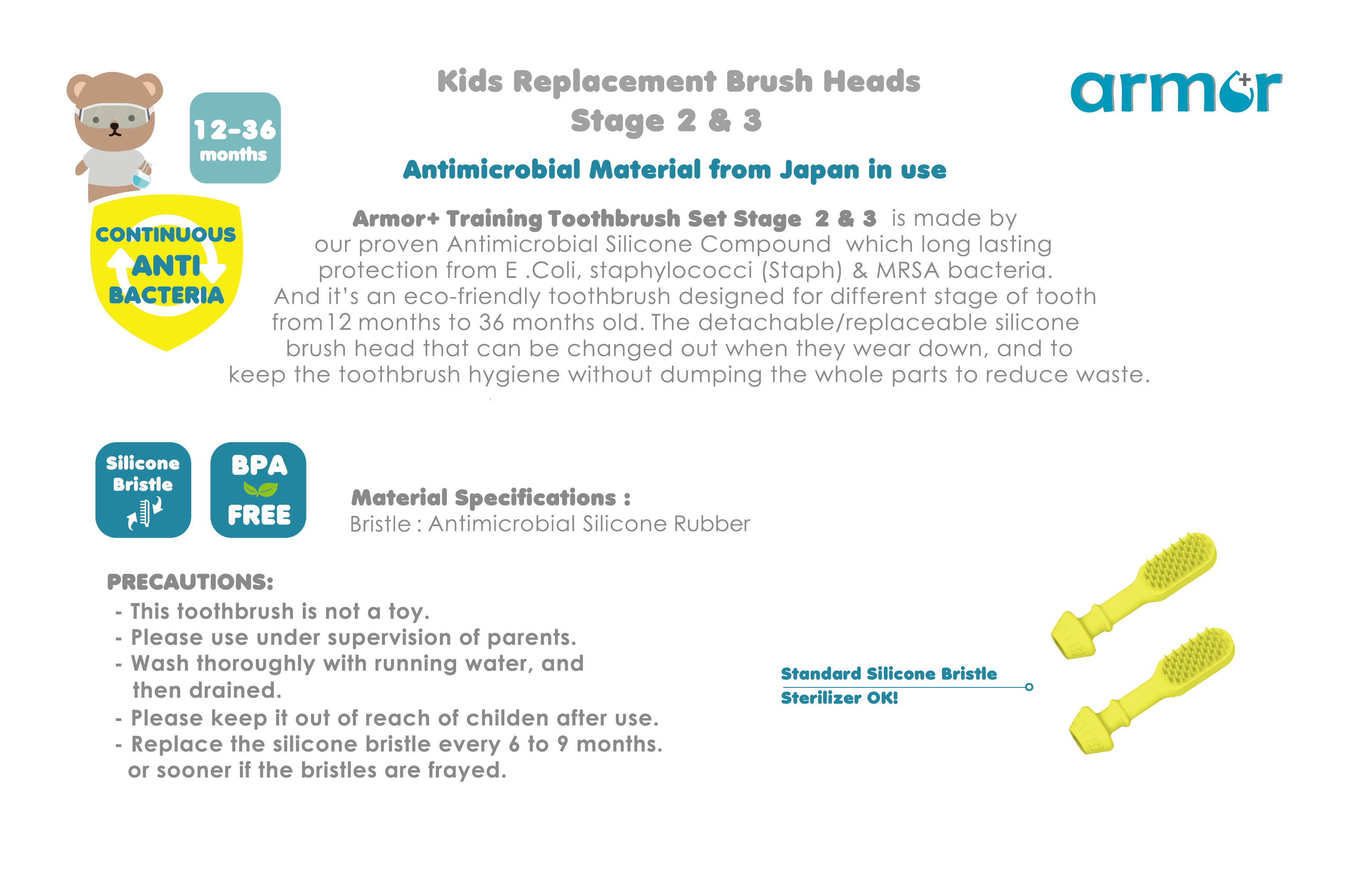 Replaceable silicone bristles is made by our proven antimicrobial silicone compound which long lasting protection from E. Coli, Straphylococci (Staph) & MRSA bacteria.