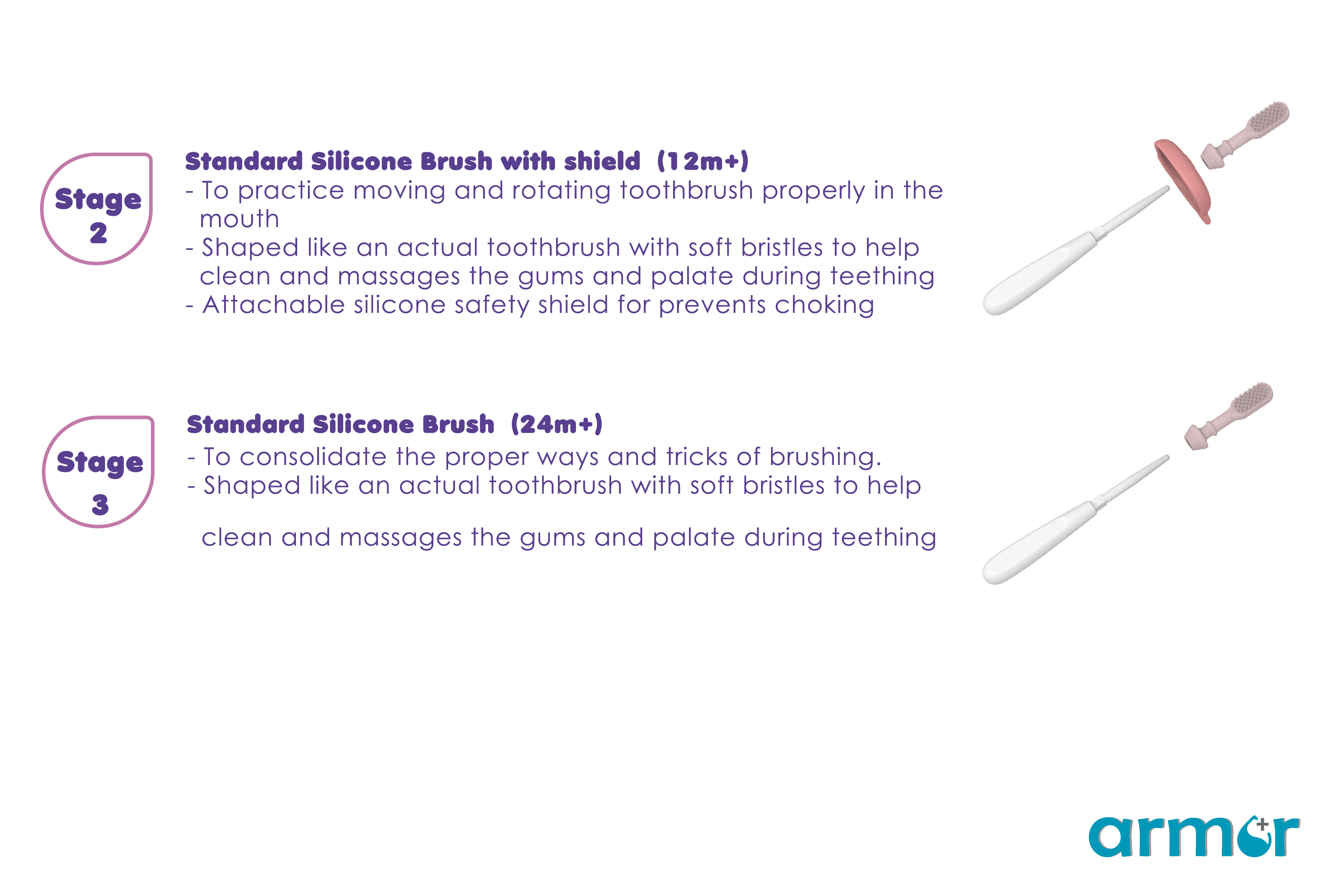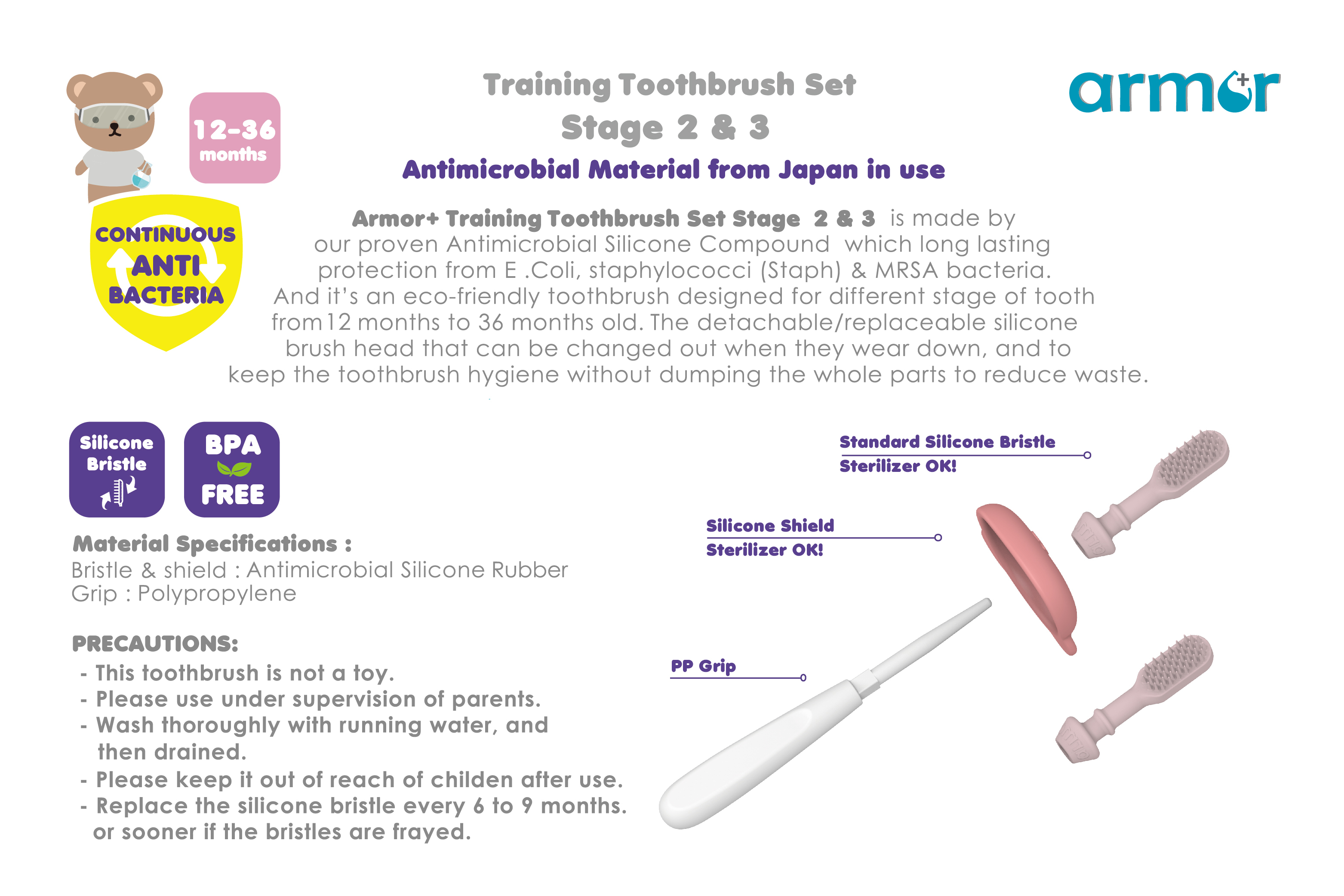 Armor+ Training Toothbrush Stage 2-3 is designed with assembled silicone bristles, which is convenient for mothers to take apart, wash and cook. In addition, the silicone bristles are made of Japanese antibacterial silicone formula, which can effectively prevent the growth of different bacteria, including common in toilets E. coli, Staphylococcus and drug-resistant Staphylococcus aureus, etc.